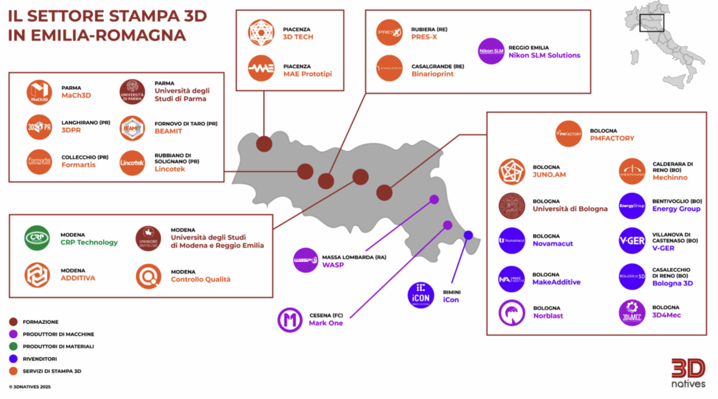 Come emerge dalla mappa, Bologna si conferma come uno dei poli principali per l’Additive Manufacturing in Emilia-Romagna. Qui, tra i produttori di macchine, troviamo 3D4MEC, produttore di stampanti 3D LPBF per acciai al carbonio, ottone e le leghe a base di rame, e Norblast che progetta e realizza soluzioni avanzate di post-processing. La provincia di Bologna vede inoltre un buon numero di service stampa 3D, come JUNO.AM o PMFactory, e rivenditori di macchine e materiali per ogni esigenza.